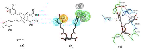 More specifically, cynarin obtained a CDOCKER energy of 42.08 and CDOCKER interaction energy of 52.92, and formed hydrogen bond interactions with PHE288, GLN212, ARG77, and CYS289, and hydrophobic interactions with PHE54, LEU183, LEU211, and PRO292. The details are shown in Figure 4. In addition, the docked pose of cynarin was screened with the pharmacophore model to further ensure the docked pose fit the pharmacophore model. The result indicated that cynarin was mapped with three features of the optimal pharmacophore model and the fitvalue was 0.66. Moreover, one benzene ring A’’ of cynarin could form hydrophobic interactions with PHE54, LEU211, and PRO292, which mapped with one H feature in the pharmacophore model. Another benzene ring B’’ of cynarin formed hydrophobic interactions LEU183 and PRO292, and also mapped with another H feature in the pharmacophore. Compared with D99 and TAK-475, cynarin formed similar hydrophobic interactions with PHE54, LEU183, LEU211, and PRO292. Moreover, the features contained in the pharmacophore model of Hypo1 and the specific hydrophobic interactions formed between cynarin and SQS were consistent. The rationality of our pharmacophore model and molecular model were also confirmed.