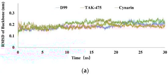 (a) The trajectory of MD simulations of three complexs: average protein RMSD; Blue, red and green bars represent for the data of D99, TAK-475 and cynarin, respectively; (b) Root mean square fluctuation (RMSF) corresponds to MD trajectory; (c) the analysis of hydrophobic residues implicated in docking.