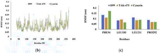 MD simulations were implemented to analyze the binding stability of SQS-cynarin, SQS-D99, and SQS-TAK-475 under dynamic conditions. The RMSD of the protein backbone of each protein-ligand complex were calculated to evaluate the stability of the system [27]. The RMSD trajectories of the SQS-cynarin, SQS-D99 and SQS-TAK-475 complexes were equilibrated after 15 ns (shown in Figure 5a). The root mean square fluctuation (RMSF) was further calculated to evaluate the flexibility of the residues. The results were plotted using residue numbers at the simulation trajectory, which is shown in Figure 5b. It can be observed that the SQS-cynarin complex exhibited a similar RMSF value in comparison to the SQS-D99 and SQS-TAK475 complexes. The protein residues with lower RMSF value are regarded as more stable [28]. Then, by analyzing the flexibility of the important hydrophobic residues, including PHE54, LEU183, LEU211, and PRO292, these amino acids in the cynarin complex had similar RMSF values as in the D99 and TAK-475 complexes (shown in Figure 5c), which were regarded as important and stable hydrophobic interactions between cynarin and SQS.