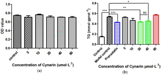 To test the lipid-lowering effect of cynarin (CAS number: 19870-46-3), sodium oleate-induced HepG2 cells were treated with various doses of cynarin (5, 10, 20, 40, and 80 μmol·L−1), and the positive compound pravastatin, respectively. The control group cells were cultured with only HepG2 cells. The model control group cells were the hyperlipidemia cell model. The positive control group cells were cultured with pravastatin. Firstly, the MTT assay was utilized for the detection of cell viability, with the result shown in Figure 6a. From the result, the five different concentrations of cynarin were not cytotoxic to HepG2 cells compared to the control group (p > 0.05).
