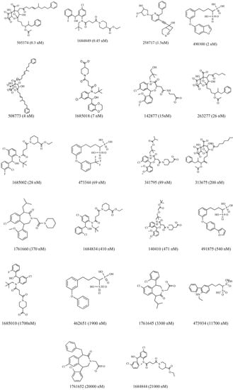 Among the library compounds 22 active compounds were selected as the training set and were used to generate HipHop pharmacophore models by using DS 4.0 from Accelrys (San Diego, CA, USA). The structure, ID numbers, and biological activity (IC50) values of the compounds are shown in Figure 7. Then, 154 active compounds and 462 inactive compounds [38], which selected randomly from the Binding Database, were regarded as the test set in order to validate the pharmacophore model. The 3D structures of all the compounds were generated using the ‘Prepare Ligands’ module and minimized in CHARMm force field [39]. The conformations of these compounds were created within an energy threshold of 20 kcal/mol by using the BEST method. The maximum ligand conformations were set to 255.