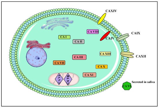 Subcellular localization of CAs. CA I, II, III, VII, VIII, X, XI and XIII are cytosolic; CA IX, XII, IV and XIV are membrane-bound; CA VA and VB are localized in mitochondria, and CA VI is secreted.