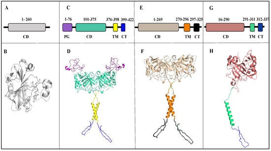 Schematic and structural representations of CA isoforms. Top panel: Schematic of domains (A) CA II: catalytic domain (grey), (C) CA IX: proteoglycan-like domain (PG, purple), catalytic domain (CD, cyan), transmembrane domain (TM, yellow) and C-terminal domain (CT, blue) (E) CA XII: catalytic domain (wheat), transmembrane domain (orange) and C-terminal domain (black) and (G) CA XIV: catalytic domain (salmon), transmembrane domain (green) and C-terminal domain (blue). Bottom panel: Cartoon representation of (B) CA II, (D) CA IX, (F) CA XII and (H) CA XIV.