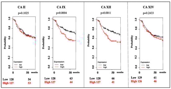 Survival plots for CA II, CA IX, CA XII, and CA XIV mRNA expression in triple negative breast cancer. Patients with high CA expression are represented in red and with low CA expression in black. High expression of CA XIV and off-target CA II does not have a significant effect on survival rate. Data shown to 70 months [53].