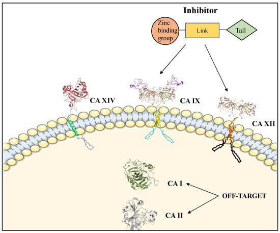 Schematic of membrane-bound CA IX, CA XII, and CA XIV and cytosolic, off-target CA II within the context of the cell. Insert: Structural components of CAIs: zinc binding group, linker and tail.