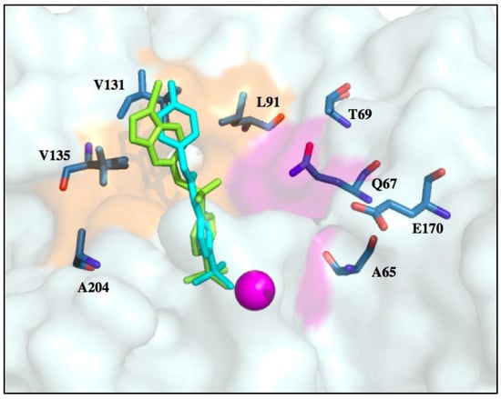 Surface representation of SLC-0111 (cyan) and E7070 (green) superimposed in the CA IX-mimic active site. Zinc is represented as a magenta sphere.