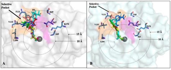 Selectively targeting CA IX or CA XII is complicated by the presence highly expressed, ubiquitous off-target isoforms such as CA I and CA II. However, differences in active site residues between these isoforms can be exploited to improve inhibitor affinity. Recent studies have shown that benzenesulfonamide-based compounds designed using the tail approach displayed nanomolar binding affinities for both CA IX and CA XII. Crystal structures of target and off-target CA isoforms in complex with this class of CAIs were analyzed in order to explain the observed isoform selectivity profile (Figure 6) [68]. CA I and CA II display a more occluded active site entrance due to the presence of bulky residues H67, F91 and Y204 in CA I and F131 in CA II that obstruct entry of the ligand. Conversely, CA IX and CA XII have smaller residues V131 and A131, respectively, resulting in a more accessible active site [68]. This information can be used to design bulkier inhibitors thereby aiding solvent displacement and severely impede inhibitor access to the active site of CA II.