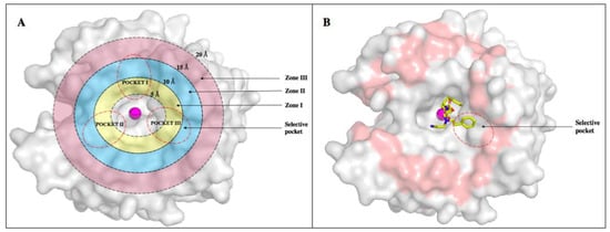 Surface representation of CA II with various zones and pockets. Active site zinc shown as magenta sphere. (A) Various zones within the active site (distance from zinc): Zone I (5–10 ) in yellow, Zone II (10–15 ) in cyan and Zone III (15–20 ) in pink. Three pockets within and around active site encircled in red dashes. (B) An inhibitor extending out of the active site in Zone III (15–20 shown in pink) of CAII (unpublished).
