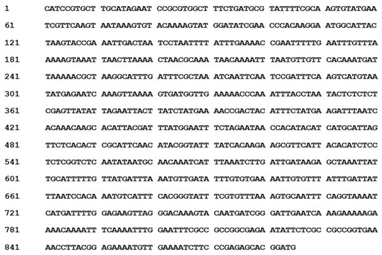 The selective 885 bp polymorphism band was amplified by the decamer random primers D15, excised from 1.5% agarose gel, and was purified with an Agarose Gel DNA Extraction Kit (Takara, Dalian, China). The purified PCR products were mixed with an adenine tail using the sequencing vector pGEM®-T (Promega, Madison, WI, USA) using an optimum insert to vector ratio, and the mixtures were incubated at 4 °C overnight to obtain the maximum number of transformants. The ligation reaction was added into the JM109 high-efficiency competent with 45 s heat-shock in a 42 °C water bath [40]. The white positive colony was selected via blue/white color screening on indicator plates and the recombinant plasmid was obtained via overnight culture. Successful cloning of the insert was identified by amplifying the vector with the specific promoter primers SP6 and T7, which were also used for sequencing.