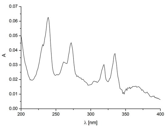 In general, hydrophobic probes enter the micellar core and hydrophilic probes localize at the micellar surface. Thus, micellar structure may be examined by using a probe designed to localize in a particular micellar zone. This incorporation causes changes in intensities, respectively, in ratio of intensities of the peaks, in the characteristic absorption and emission spectra of the probe. The absorption spectrum of pyrene in water has showed eight peaks: strong (s) and weak (w) at 232w, 242s, 252w, 260w, 272s, 308w, 320s, and 336s nm, as depicted in Figure 1 [16,32,33]. The concentration of used pyrene was 2 µM, which was within its solubility limit of 2–3 µM. Excimer formation was expected to be absent at this concentration [16,34].