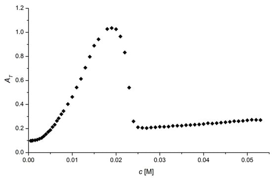 AT of main pyrene peaks at 336 and 320 nm vs. concentration (c) profile for compound 5 in aqueous medium at 25 °C in whole measured concentration range.