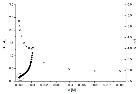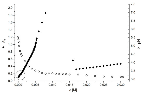 AT of main pyrene peaks at 336 and 320 nm vs. concentration (c) profile for compound 7 in aqueous medium at 25 °C in whole measured concentration range (◆); circle indicates concentration range where cmc was determined; pH values vs. concentration (c) profile at 25 °C (○).