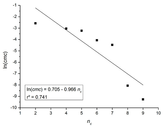 In this study, the ln(cmc) values were calculated, and the plot of ln(cmc) vs. the number of carbon atoms, nc, in the hydrophobic chain is illustrated in Figure 6. The critical micellar concentration values decreases with increasing number of carbon atoms.