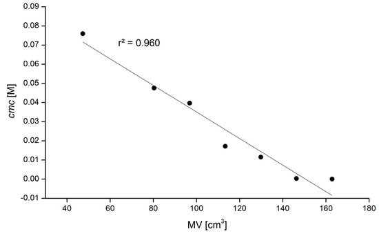 Dependence of cmc values on bulkiness alkoxy tail expressed as molar volume (MV [cm3]) of substituent R.