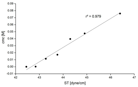 As mentioned above, the discussed compounds can be considered as surfactants, i.e., their biological effect is connected with the increasing surface activity (i.e., a longer tail as R substituent is preferable). This parameter is reflected in the bulkiness/molar volume (MV [cm3]) of the alkoxy chain (substituent R). The surface tension (ST [dyne/cm]) of the compound is also connected with the length of the alkoxy tail. The calculated values of surface tension increase (i.e., surface activity decreases) with decreasing bulkiness, expressed as molar volume (reflecting a decrease in the length of the alkoxy tail). The dependence of the cmc values of the discussed compounds on the bulkiness/molar volume (MV [cm3]) of the alkoxy chain is illustrated in Figure 7. It can be stated that the cmc values of the compounds linearly decrease (nc = 7, r2 = 0.960) with increasing bulkiness (the length of the tail). On the other hand, but logically, the cmc values linearly increase (nc = 7, r2 = 0.979) with increasing surface tension (i.e., with a decrease of surface activity), see Figure 8, where the dependence of the cmc values on the surface tension of the compounds is illustrated. These linear dependences showed in Figure 7 and Figure 8 underline the accuracy of the determined cmc values of the discussed compounds and their usefulness for investigation of compounds of a similar type. Our results showed a close relationship between the experimentally determined cmc and surface activity, respectively, biological activity of the compounds.