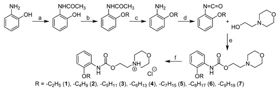 Synthesis of 4-(2-{[(2-alkoxyphenyl)carbamoyl]oxy}ethyl)morpholin-4-ium chloride 1–7. Reagents and conditions: (a) (CH3CO)2O, room temperature, 1 h; (b) Na, EtOH, alkylbromides, reflux, 3 h; (c) 18% HCl, reflux, 2 h; (d) COCl2, toluene, reflux, 3 h; (e) toluene, reflux, 3 h; (f) HCl, Et2O [10,11].