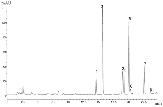 HPLC was performed using an HP 1050 device (Hewlett-Packard, Palo Alto, CA, USA), an Agilent G1315B DAD detector (Agilent, Santa Clara, CA, USA), and a Phenomenex Luna C18 (2), 3 µm, 2 × 150 mm column (Phenomenex, Torrance, CA, USA). Mobile phases (acetonitrile–water–o-phosphoric acid) were as follows: mobile phase A—5% acetonitrile + 0.1% o-phosphoric acid; mobile phase B—80% acetonitrile + 0.1% o-phosphoric acid. The gradient was 20% B–80% B for 20 min and then 80% B–100% B for 5 min. The flow rate was 0.25 mL/min. The injected volume was 5 µL. The column temperature was 25 °C. The separation was monitored at 315 nm.