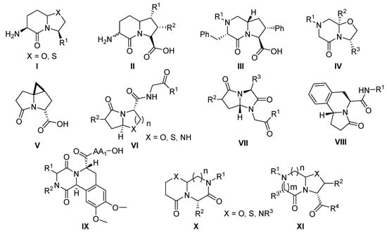 Incorporation of fused lactam rings was also frequently applied for the synthesis of peptidomimetics [8,21]. The constrained structures were designed to mimic β-turns, the most frequent secondary structure found in proteins. Amino acid motifs constrained within a bicyclic lactam architecture have been applied to the design of modified peptides and peptidomimetics to discover new therapeutics and better understand the interactions of ligands with target enzymes and receptors. Compounds I [19,22] and II [23] (Figure 1) were designed as β-turn mimetics, and scaffold III [24] was synthesized as a conformationally constrained analogue for the Phe7-Phe8 region of substance P. The solution-phase synthesis of constrained dipeptide surrogates comprising [6 + 5]-fused lactams (structure IV) from 3-aza-1,5-diketoacids and amino alcohols was developed using a one-pot strategy [17]. Tricyclic constrained scaffold V was reported as a carbapenem mimetic [25]. Nielsen et al. synthesized a range of bicyclic dipeptide mimetics forming 5-hydroxylactam/N-acyliminium ion intermediates [15]. Depending on the amino acid side-chain, the cyclization occurs as side-chain cyclization VI if a nucleophilic moiety (X = O, S, NH, n = 1–3) is presented in the side-chain and as backbone cyclization VII in absence of heteroatomic moieties in the side-chain. Their studies on N-acyliminium Pictet-Spengler reactions [26] were extended to synthesize pyrroloisoquinolines VIII [27] or with an indole moiety and heterocycles such as furans and thiophenes to yield tri- and tetracyclic scaffolds [28]. Additionally N-carbamyliminium Pictet-Spengler reaction was used to form tetrahydro-β-carbolines and tetrahydroisoquinolines [29]. Synthesis of fused natural product-like diketopiperazines comprising different ring combination yielded molecular scaffolds IX [30].