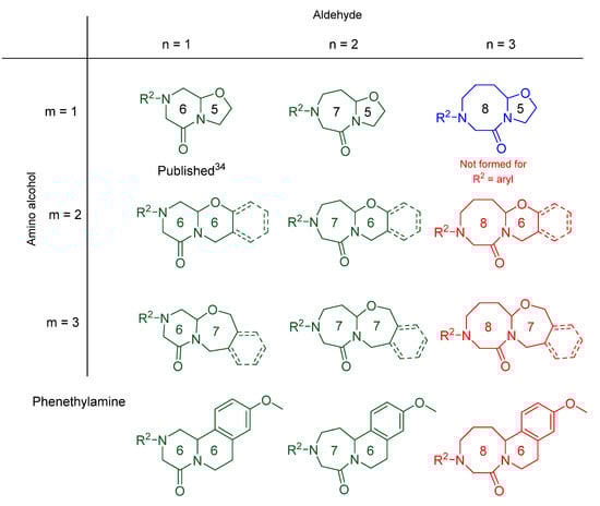 Color-coded structures of fused scaffolds. Green: good to excellent purity of product; blue: only specific combination was formed; red: no cyclic product detected.