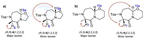 The reactions with (R)-α-bromopropionic acid provided [7 + 6]-fused ring model compounds 6{2,2,3,2} as a 55:45 mixture of diastereomers (Table 2). Both isomers were isolated by reversed-phase HPLC, and their structures were confirmed by 1D and 2D NMR spectroscopy. The NOESY experiments were performed in CDCl3 because of the overlap of the resonances of protons H6 and H10a in DMSO-d6. The results indicated that the major isomer prepared using (R)-α-bromopropionic acid was (S,S)-6{2,2,2,2} and the minor isomer was (S,R)-6{2,2,2,2} (Table 2).
