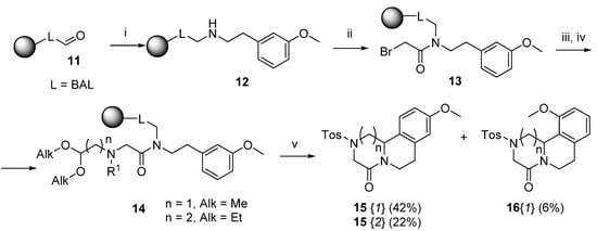Polymer-supported synthesis of fused bicyclic compounds 15 and 16. Reagents and conditions: (i) 0.5 M 2-(3-methoxyphenyl)ethan-1-amine in 10% AcOH/DMF, rt, overnight, then NaBH(AcO)3, rt, 5 h, then a second portion of NaBH(AcO)3, rt, 3 h; (ii) bromoacetic acid, DIC, DCM, rt, 1 h; (iii) amino-aldehyde dialkyl acetal, DIEA, DMF, rt, 2 h; (iv) Tos-Cl, DIEA, DCM, rt, 2 h; (v) TFA/DCM (1:1), rt, 1 h.