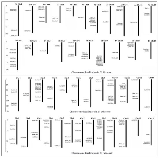 Chromosomal localization of P-ATPase genes in G. hirsutum, G. arboretum, and G. raimondii. Number of P-ATPase genes on each chromosome and location of each gene on the chromosome are shown on the map. Scale number is in megabases (Mb).