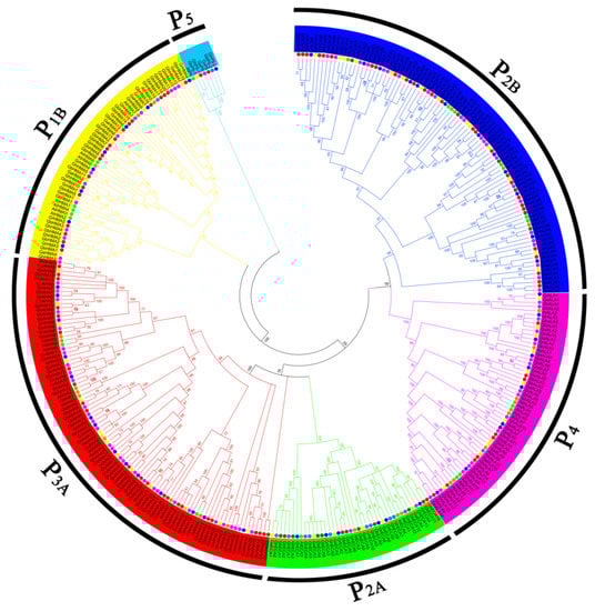 Phylogenetic tree of P-ATPase genes in various cottons and Arabidopsis, constructed by neighbor-joining (NJ) using MEGA 5 software (1000 bootstrap replicates). Different colors indicate different subfamilies of P-ATPase, the green, orange, blue, red and purple dots indicate Arabidopsis, G. arboretum, G. raimondii, G. barbadense and G. hirsutum respectively.