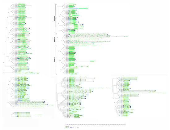 To gain insight into the evolutionary relationship of P-ATPase genes in G. arboretum, G. raimondii, G. barbadense and G. hirsutum, a phylogenetic tree was constructed according to the protein sequences of the P-ATPase genes in four cotton species, and the P-ATPase gene structures were analyzed with their CDS sequences using the GSDS online tool [18]. The results showed that most P-ATPase genes contained introns and exons, and most P-ATPase genes in G. raimondii and G. barbadense also contained untranslated regions (UTRs). Almost all P3A subfamily genes contained 10–20 introns, the P1B subfamily genes contained 5–20 introns, and most P2A subfamily genes contained 5–10 introns, but some genes contained more than 20 introns (Figure 3). Interestingly, the structures of the P1B subfamily genes on different branches had significant differences. Most genes in class C did not contain introns or contained only one, and most genes in class A contained 5–7 introns, but all genes in class B contained more than 30 introns. In the phylogenetic tree, the gene structures of most paralogous gene pairs between G. hirsutum and G. arboretum/G. raimondii were very similar, which suggests that their genetic relationship is close, and these paralogous genes had high homology. However, the gene structures of paralogous gene pairs between G. barbadense and G. arboretum/G. raimondii were not close, which indicates that G. hirsutum has a closer genetic relationship to G. arboretum/G. raimondii than G. barbadense.