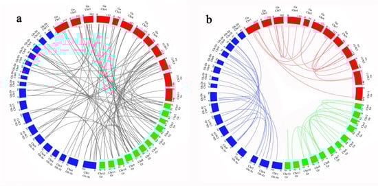 Collinearity analysis of P-ATPase genes in G. hirsutum, G. arboreum, and G. raimondii.; (a) Duplication between G. hirsutum, G. arboreum, and G. raimondii, (b) Duplication within G. hirsutum, G. arboreum, and G. raimondii. Red, blue and green rectangles represent chromosomes of three cotton species. Blue, orange and gray lines represent genetic duplication in three cotton species themselves, and green lines indicate genetic duplication between different cotton species.