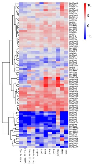 P-ATPase plays a variety of roles in plant cells. Thus, to realize the function of P-ATPase genes in G. hirsutum, the expression of P-ATPase genes in the different tissues (leaf, petal, pistil, root, stamen, stem and torus) and fibers was analyzed at various developmental stages (5 DPA,10 DPA, 20 DPA and 25 DPA). Among the 98 genes, 84 P-ATPase genes were at least expressed in one tissue or at one developmental stage of fiber because the value of log2 FPKM was more than 1. The heat map was plotted using R software. The results indicated that 84 P-ATPase genes might play a role at various growth stages of cotton, and the remaining 14 genes might be expressed in a special environment or were only pseudogenes. More than one-third of the 84 P-ATPase genes were widely expressed in the various tissues of cotton and at three developmental stages of cotton fiber, which suggested that these genes may participate in the whole growth and fiber development of cotton (Figure 5). In addition, some genes were highly expressed in the petal and pistil or stamen, suggesting that these genes may play a role in flower development. A few genes had higher expression at the three developmental stages of cotton fibers compared to other tissues, indicating that these genes are involved in the regulation of cotton fiber development. In the stem, leaf, and root, a few genes were highly expressed, showing that these genes may be involved in stress resistance. Interestingly, seven P-ATPase genes (GhAHA1, 2, 4–8) were only expressed in the stamen, suggesting that these genes are associated with a specific role in the development of the cotton stamen (Figure 5 and Table S4). A significantly different expression pattern in P-ATPase members in the same subfamily was observed, signifying that these genes performed functional differentiation, while a similar expression pattern of some genes from different subfamilies was observed, which showed that these genes may have a kind of synergy.