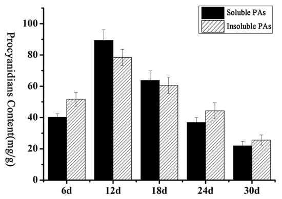 PA content at different development stages of brown cotton fibers. Abscissa indicates different days post anthesis of cotton fibers, and ordinate indicates PA content, the error bars indicate SE.