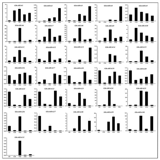 Relative expression levels of the P3A-ATPase genes at different development stages of brown cotton fiber. The relative expression level was calculated using the 2−△△Ct method, the error bars indicate SE.
