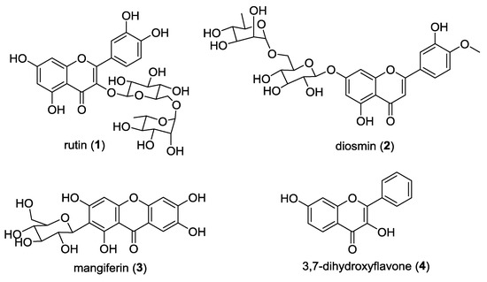 Flavonoid and xanthone derivatives comprise two classes of oxygenated heterocycles associated with a large number of biological and pharmacological activities [1,2]. These compounds also occur in nature as glycosides, which have been shown to have several biological activities, namely, antimicrobial [3,4,5], antioxidant [6,7,8,9], and antitumor [10,11]. Flavonoid glycosides are widely present in vegetables and fruits and can be found with different types of glycosides, while xanthone glycosides are mainly found in the families Gentianaceae and Polygalaceae with a glucose moiety [12]. In particular, acetylated flavonoid and xanthone glycosides have been reported as bioactive compounds with antioxidant [13,14] and antitumor activities [15,16,17,18,19]. The last step in flavonoid biosynthesis is, in some plant species, terminated by acylation, which is known to increase the solubility and stability of glycosylated flavonoids in lipophilic systems [20]. Thus, we were inspired to perform acetylation and glycosylation in natural flavonoids and xanthones. Rutin (1), diosmin (2), and mangiferin (3) were selected for acetylation due to their use in therapy and/or investigation in clinical trials, and 3,4-dihydroxyflavone (4) was selected for glycosylation to study the structure-activity relationship (Figure 1). All these starting materials have previously been shown to display in vitro and in vivo antitumor activity [11,21,22,23,24].