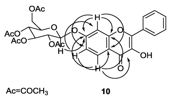 For instance, the IR spectrum of compound 9 showed a strong band at 1750 cm−1, which is characteristic of the C=O ester stretching vibration. 1H and 13C NMR spectra of compound 9 indicated the presence of a flavone moiety and of two sugar moieties. 1H and 13C NMR spectra of compound 10 indicated the presence of a flavone moiety and one acetylated sugar moiety. The assignments of the carbon atoms directly bonded to proton atoms were achieved from heteronuclear single quantum correlation (HSQC) experiments, and the chemical shifts of the carbon atoms not directly bonded to proton atoms were deduced from heteronuclear multiple bond correlation (HMBC) correlations. For instance, Figure 2 shows the correlations found for compound 10.