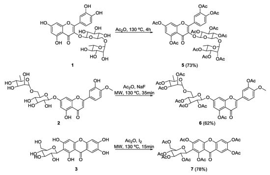 In this work, four acetylated flavonosides (5, 6, 9, and 10), and one xanthonoside (7) were synthesized. As far as we know, compounds 9 and 10 are described for the first time. Compound 5 was synthesized without pyridine in a shorter reaction time. Applying MW irradiation to the synthesis of compounds 6 and 7 allowed to shorten the reaction times.