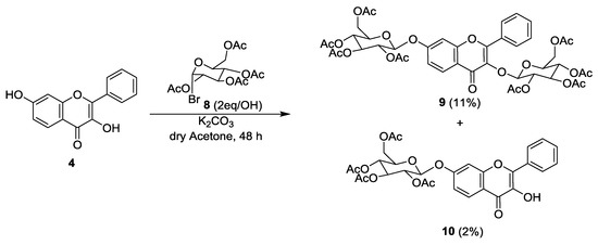 For glycosylation of flavone 4, 2,3,4,6-tetra-O-acetyl-α-d-glucopyranosyl bromide (8) was selected as glucose donor and two reaction methods were applied: a Koenigs-Knorr method [33,34,35] and a modified Michael method [36]. Both reactions were carried out at room temperature to decrease the number of side products [37]. Formation of glycosylated products could not be observed using the Koenigs-Knorr approach, even with the addition of 3 equivalents/OH of 2,3,4,6-tetra-O-acetyl-α-d-glucopyranosyl bromide (8). Using the modified Michael method, with K2CO3 in dry acetone, it was possible to obtain two glycosylated products (Scheme 2), the 3,7-(2,3,4,6-tetra-O-acetyl-β-glucopyranosyl) flavone (9) and the 3-hydroxy-7-(2,3,4,6-tetra-O-acetyl-β-glucopyranosyl) flavone (10), although with low yields (11% and 2%, respectively).