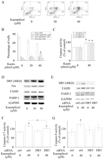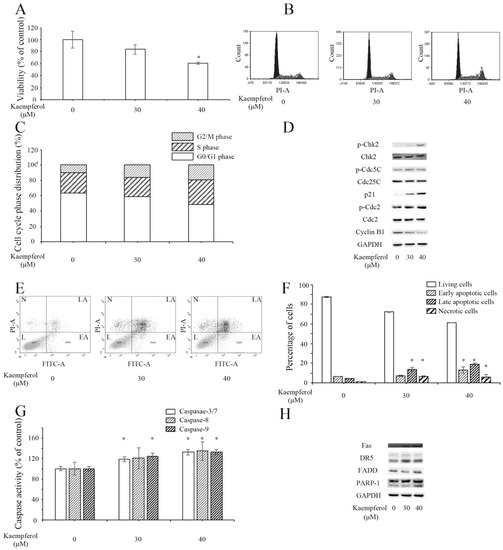 Reagents: Kaempferol was purchased from Sigma. Dead Cell Apoptosis Kit with Annexin V Alexa Fluor® 488 and propidium iodide (PI) was purchased from ThermoFisher Scientific (Waltham, MA, USA). Caspase-Glo® 3/7 Assay Systems, Caspase-Glo® 8 Assay Systems and Caspase-Glo® 9 Assay Systems were purchased from Promega (Madison, WI, USA). Antibodies against p21 Waf1/Cip1 (p21), p-Cdc25C (Ser 216), Cdc25C, p-Cdc2 (Tyr 15), Cdc2, Cyclin B1, p53, death receptor 5 (DR5), Fas, and Fas-Associated protein with Death Domain (FADD) were purchased from Cell Signaling Technology, Inc. (Danvers, MA, USA). Antibodies against phosphor-checkpoint kinase 2 (Chk2) (Thr68), Chk2, poly [ADP-ribose] polymerase 1 (PARP-1), and glyceraldehyde-3-phosphate dehydrogenase (GAPDH) were purchased from Santa Cruz Biotechnology Inc. (Santa Cruz, CA, USA).