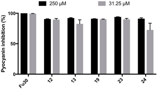 The compounds were effective in inhibiting pyocyanin in the range of 90–94% at 250 µM. The compounds also showed potent activity at a lower concentration of 32 µM (80–89% inhibition). Our QS-based inhibitors showed comparable pyocyanin inhibition activity to those reported by others [24]. The outcome of this assay correlates well with the potent QS activity of these compounds.