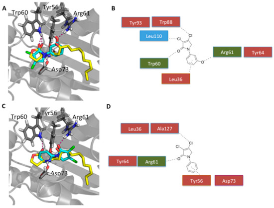 The potent QS inhibitors 19, 23 and 24 form the same hydrogen bond with Arg61 and have a flipped orientation relative to the lactone head, but they form different interactions between the phenyl and the LasR binding pocket. The 4-aminophenyl group in Compound 19 forms an electrostatic π-anion with Asp73. This suggested that NH2 is not required for activity since Compounds 23 and 24 lack the amino group and yet have potent QS inhibition. Although there are no significant differences in QS activity between 23 and 24, the phenyl groups differ in the type of interactions they produce. Compound 23 makes hydrophobic interactions as shown in Figure 3C,D, while Compound 24 only forms an electrostatic π-anion interaction with Asp73. For the majority of docked compounds, the halogen at the 3-position of the lactam ring was not predicted to make any interactions with the LasR pocket except halogen interaction with Leu110 for Compound 13 and the least active compounds including 15, 33, 35–38 and 40–41. In contrast, the halogen at the 4-position was predicted to form hydrophobic interactions with the pocket for every docked compound including the most active ones. To further investigate the importance of these observations, a new series of compounds similar to those detailed in this study should be synthesized that lack a halogen at the 3-position of the lactam ring and have various hydrophobic alkyl or aromatic groups at the 4-position. Detailed docking results are provided in the Supplementary Information.