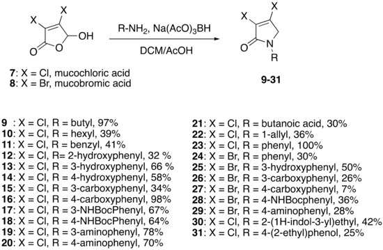 Reductive amination of mucochloric acid 7 and mucobromic acid 8 to generate lactam Compounds 9–31.