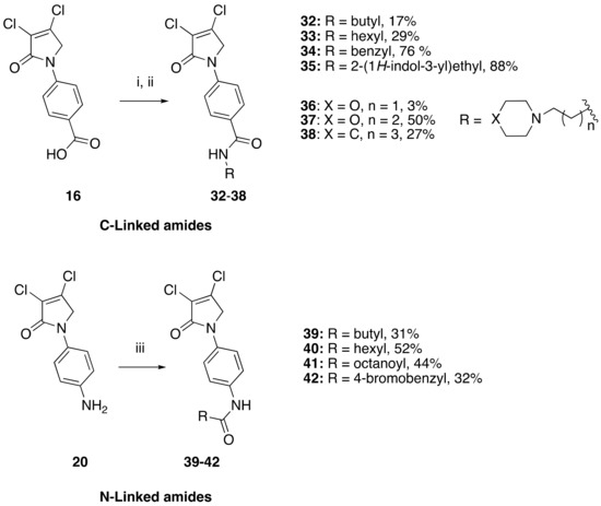 Additional amide groups were introduced into the lactam compounds to elaborate the structure-activity relationship (SAR) surrounding these compounds. We envisaged that the amide functionality might offer additional capacity to form hydrogen bonds with the biological target, the LasR receptor protein, and thus enhance quorum sensing inhibition (QSI). Therefore, the C-linked amides 32–38 and the N-linked amides 39–42 were targeted (Scheme 2). Mucochloric acid derivatives 16 and 20 were selected for the synthesis of the amides due to their high yields and ease of synthesis. To generate the C-linked amides, various amide coupling reagents such as 1-Ethyl-3-(3-dimethylaminopropyl)carbodiimide (EDC)/hydroxy benzotriazole (HOBT), N,N-diisopropyl ethylamine (DIPEA) and hexafluorophosphate benzotriazole tetramethyl uronium (HBTU) were used to couple the 4-carboxylphenyl mucochloric acid derivative 16 with various aliphatic amines; however, low yields of the products were obtained. Therefore, the acid 16 was instead converted to the corresponding acid chloride using SOCl2 and then reacted with the corresponding amines in the presence of triethylamine to give the target Compounds 32–38 in variable yields (Scheme 2). Difficulties in the purification of the products were the main cause for the lower yields.