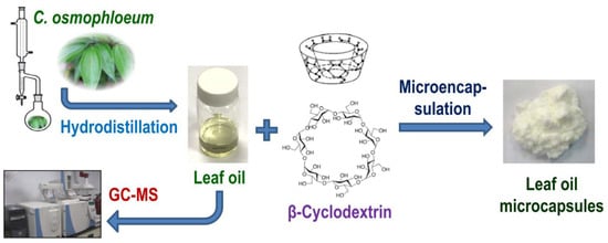 A schematic illustration of the hydrodistillation of Cinnamomum osmophloeum leaf oil and microencapsulation of the leaf oil with β-cyclodextrin is shown in Figure 1.