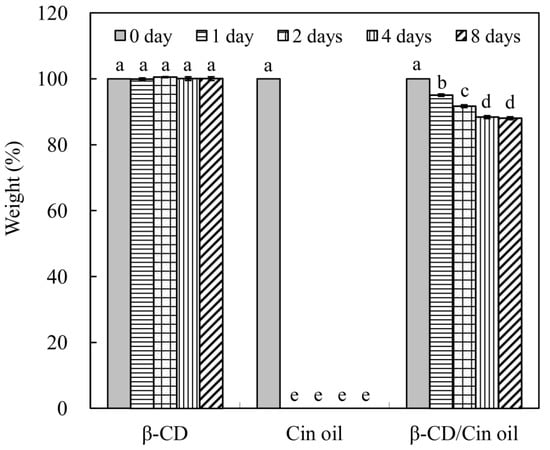 Changes in weight of leaf oil microcapsules during the dry-heat aging test. β-CD: β-cyclodextrin; Cin oil: C. osmophloeum leaf oil; β-CD/Cin oil: leaf oil microcapsules; Different letters (a–e) in the Figure refer to statistically significant difference at the level of p < 0.05 according to the Scheffe’s test.