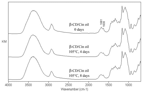 Changes of the characteristic peaks occurred in the FTIR spectrum of C. osmophloeum leaf oil microcapsules (β-CD/Cin oil) after the dry-heat aging test, as shown in Figure 4. The relative intensities of the absorption peaks at 1630 cm−1 and 1681 cm−1 decreased during the aging period. Peaks at 1630 cm−1 (for C=C stretching vibrations) and 1681 cm−1 (for C=O stretching vibrations) are the characteristic absorptions of the extended conjugation structure of trans-cinnamaldehyde [22], the major constituent of leaf oil. The decrease of these absorption bands with the aging period resulted from the emission of trans-cinnamaldehyde in the environment at 105 °C. The characteristic absorption bands of β-cyclodextrin are 3386 cm−1 (for O-H stretching vibrations), 2926 cm−1 (for -CH2 asymmetrical stretching vibrations) and 1165 cm−1 (for C-O stretching vibrations) [23,24,25]. These characteristic peaks of β-cyclodextrin didn’t show any differences in the FTIR spectrum after the dry-heat aging test; revealing that the molecules of β-cyclodextrin were thermostable during 8 days of aging. The results from the FTIR spectroscopic analysis ensured the consistency of the thermostability of β-cyclodextrin observed in Figure 3. Most constituents of the leaf oil were control released from the microcapsules during the dry-heat aging test.