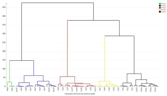 Dendrogram of HCA for honeys. Ra: rapeseed (Brassica campestris L.); Ac: Acacia (Robinia pseudoacacia L.); Li: linden (Tiliaamurensis Rupr.); As: Astragalus (Astragalus membranaceus (Fisch.) Bunge); Co: Codonoposis (Codonopsis pilosula (Franch.) Nannf.); Vi: vitex (Vitex negundo var. heterophylla Rehd.).