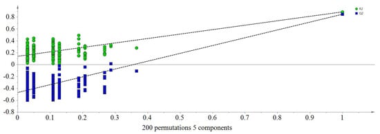 An orthogonal partial least squares-discriminant analysis (OPLS-DA) model was constructed by paired analysis of each honey and the rest, which provided the information of the correlations between specific markers and each particular honey type. Q2 (cum) parameters for samples from acacia, Vitex, linden, rapeseed, Astragalus and Codonopsis origins were 0.881, 0.899, 0.886, 0.720, 0.558 and 0.575, respectively, which showed acceptable predictability for honeys from different floral origins (Figures S2–S7). Cross validation was evaluated using a permutation test with 200 cycles, where R2 and Q2 were calculated as the goodness of fit and the predictive capability of the model, respectively. Generally, the larger values of slope for R2 and Q2 and the larger value of difference between two parameters represented an excellent model, as shown in Figure 3.