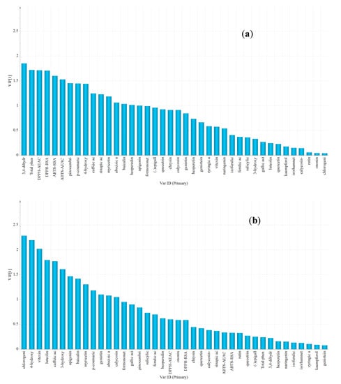 The significance of variables was evaluated using the variable importance in the projection (VIP) method, and the specific variables were determined according to VIP value of more than 1.5 [24]. Overall, acacia honey was distinguished from other honeys because of lower contents of 3,4-dihydroxybenzoic acid, TPC, pinocembrin, p-coumaric acid, 4-hydroxybenzoic acid, and lower values of DPPH-RSA, DPPH-AEAC, ABTS-RSA and ABTS-AEAC antioxidant properties than other honeys (Figure 4a). Vitex honey was obviously identified from other honeys based on the highest contents in chlorogenic acid, 4-hydroxybenzoic acid, vitexin, luteolin, caffeic acid and 3-hydroxy-benzoic acid (Figure 4b). Linden honey samples were characterized by a higher content of baicalin and 3,4-dihyroxybenzoic acid, a lower content of isorhamnetin and gallic acid and no detection of sinapic acid (Figure 4c). Rapeseed honey samples showed high correlations with a higher content of syringic acid, and a lower content of luteolin, caffeic acid, rutin and the absence of (−)-epigallocatechin (Figure 4d). Moreover, Astragalus and Codonopsis honeys were distinguished from other honeys by a higher content of calycosin and formononetin, and Astragalus honeys showed high correlations with a higher content of isorhamnetin and no detection of (−)-epigallocatechin, whereas Codonopsis honey had a higher content of myricetin, rutin, gallic acid and TPC, which was used for discriminating (Figure 4e,f).