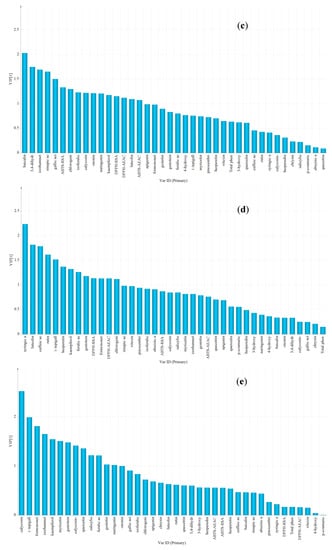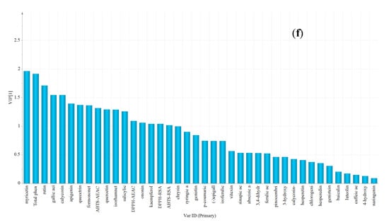 The VIP plot by OPLS-DA corresponding with discrimination between (a) Acacia versus rest; (b) Vitex versus rest; (c) Linden versus rest; (d) Rapeseed versus rest; (e) Astragalus versus rest and (f) Codonopsis versus rest.