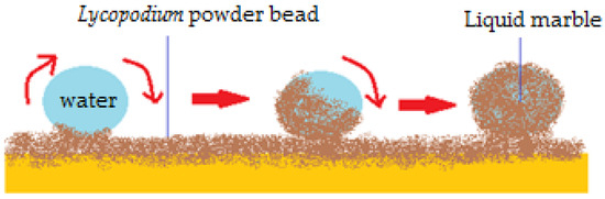 A similar behavior was signaled by Aussilous and Quéré [2] in 2001 for liquid droplets encapsulated in solid particles, which became known as “liquid marbles”. The first declared liquid marbles were obtained by rolling water droplets (1–10 mm3) in a hydrophobic powder bed, made from silica-covered Lycopodium microparticles (20 µm). The droplets were immediately covered by particles, maintaining a spherical shape (Figure 1). They were transported onto a glass blade, in order to be compared with plain water drops. Liquid marbles don’t wet the surface since the liquid-solid interface (water-glass) is replaced with a solid-solid interface (Lycopodium particles-glass).