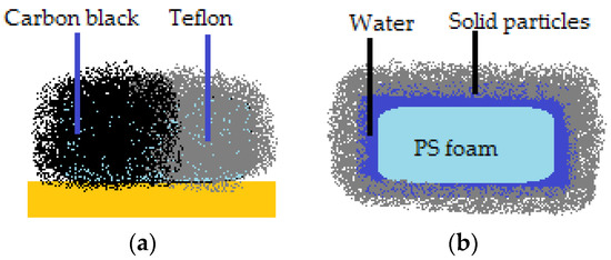 The possibility to create a liquid marble covered in a shell that doesn’t have the same properties on the whole surface, also exists. They resemble Janus particles and can be guided by electric fields. Half of the coating (spherical cap) is made from carbon black (semi-conductor), whilst the other half is made of Teflon (dielectric), as displayed in Figure 2a [20]. The Janus marble is formed after two different marbles (i.e., one covered in carbon balck and the other in Teflon) are forced together in order for coalescence to happen. Progresses was registered in the field of composite liquid marbles with special shapes, containing organic and inorganic fluids, as shown by Bormashenko et al. [21]. Thus, cubic-shaped droplets were obtained, as illustrated in Figure 2b.